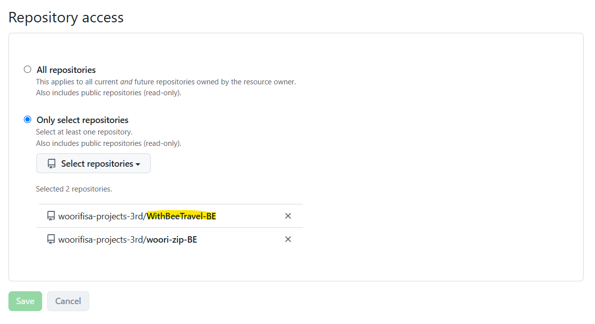 Settings → GitHub Apps → Repository access์์ ์ถ๊ฐํ ์ ์๋ค.
