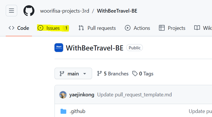 GitHub repository์ ์๋จ์ Issues ํญ ํด๋ฆญ