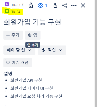 ์ฐ๋ฆฌ ํ๋ก์ ํธ์์๋ GitHub Issue๋ฅผ ์์ฑํ๋ฉด์ ์์ ์ด์(Story or Task)์ ํฐ์ผ ๋ฒํธ๋ฅผ ์ ๋ ฅํด ์ฃผ๋ฉด,