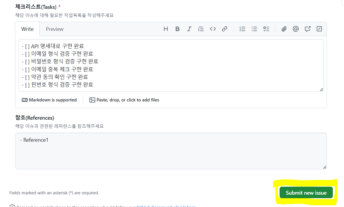 Submit new issue ๋ฒํผ์ ํด๋ฆญํ์ฌ GitHub์์ Issue ์์ฑํ๊ธฐ