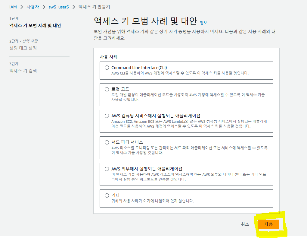 ์์ ๊ฒ์์ IAM์ ๊ฒ์ ํ ์์ธ์ค ๊ด๋ฆฌ → ์ฌ์ฉ์๋ก ์ด๋ ํ ์ฌ์ฉ์ ์์ฑ ํด๋ฆญ
