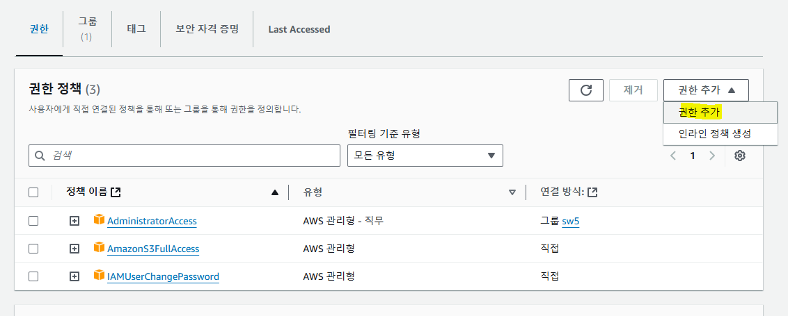 ๊ทธ๋์ ์ด๋ฏธ ์๋ IAM์ AmazonS3FullAccess ๊ถํ๋ง ์ถ๊ฐํด์คฌ๋ค.