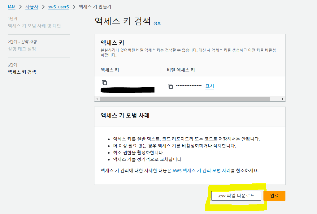๋ง๋ค์ด์ง ์์ธ์ค ํค๋ฅผ .csv ํ์ผ ๋ค์ด๋ก๋๋ฅผ ํด๋ฆญํด์ ๋ค์ด ๋ฐ์์ค๋ค.