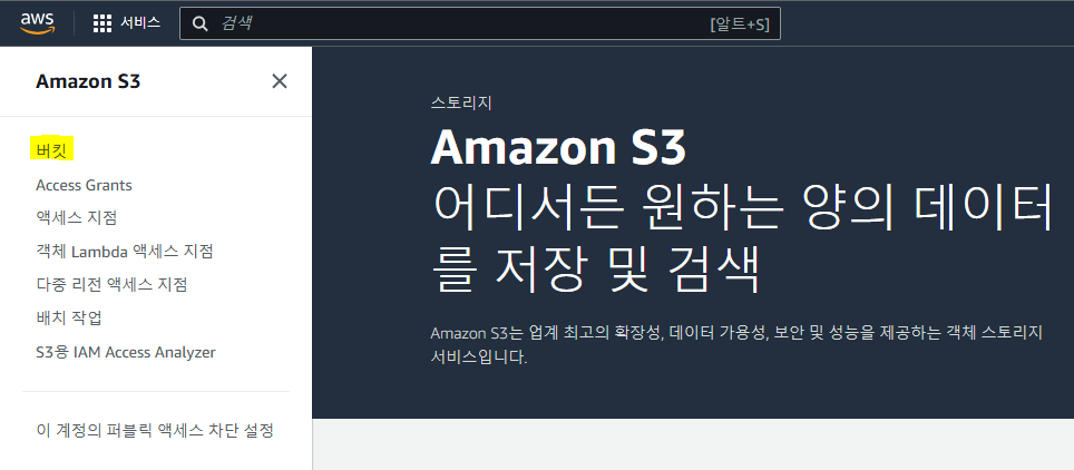 ์์ ๊ฒ์์ฐฝ์ S3๋ฅผ ๊ฒ์ํ์ฌ Amazon S3๋ก ์ด๋ํด์ฃผ๊ณ ์ผ์ชฝ ๋ค๋น๊ฒ์ด์