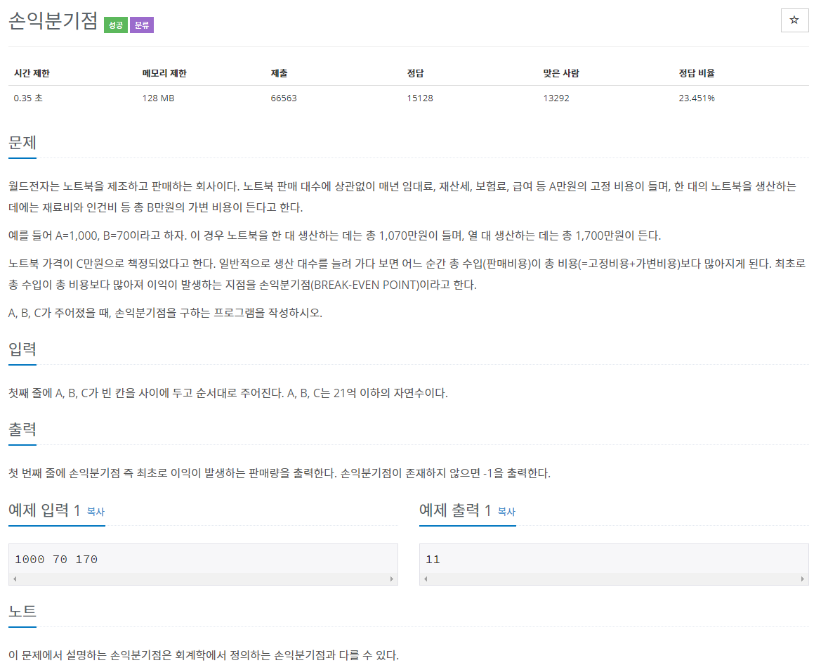 1712번: 손익분기점