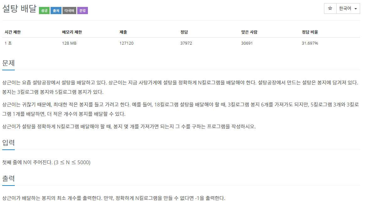 상근이는 요즘 설탕공장에서 설탕을 배달하고 있다. 상근이는 지금 사탕가게에 설탕을 정확하게 N킬로그램을 배달해야 한다. 설탕공장에서 만드는 설탕은 봉지에 담겨져 있다. 봉지는 3킬로그��