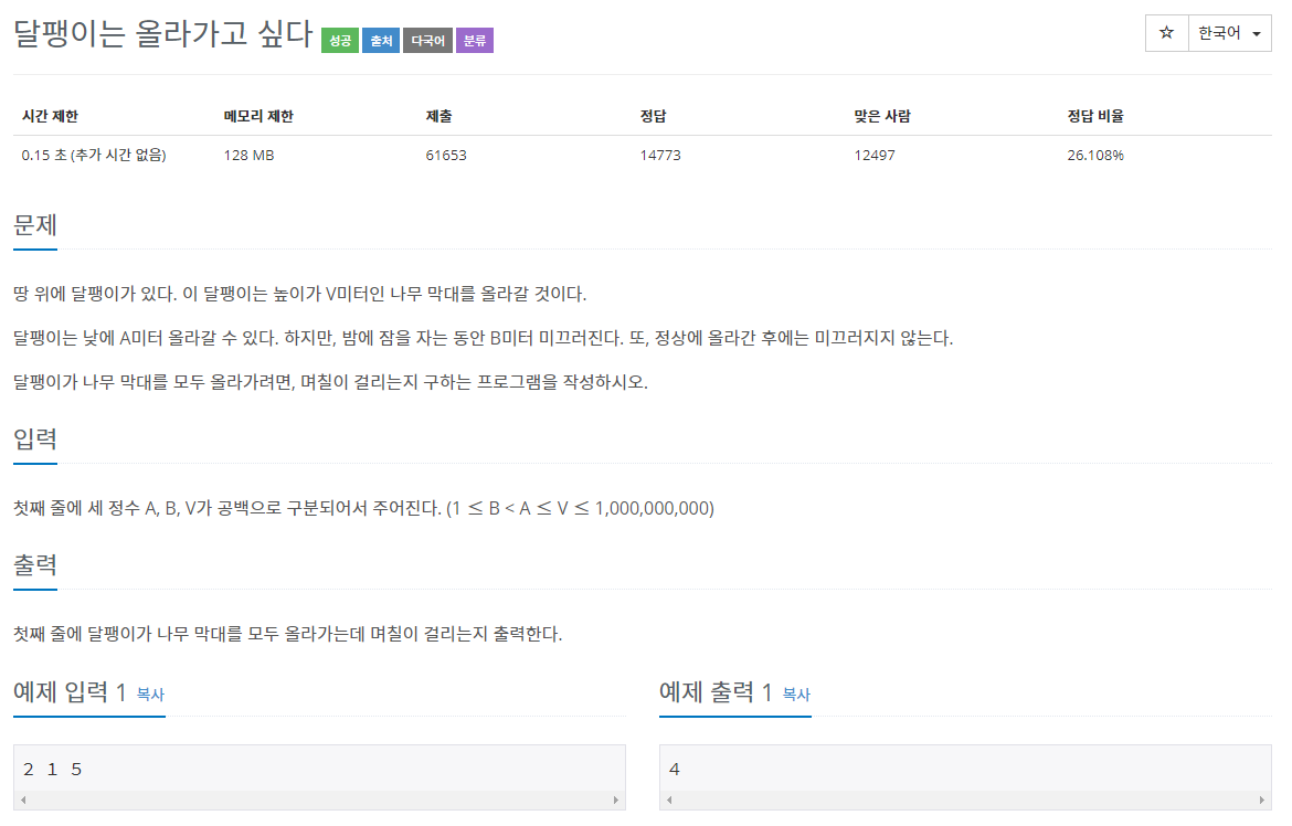 첫째 줄에 세 정수 A, B, V가 공백으로 구분되어서 주어진다. (1 ≤ B < A ≤ V ≤ 1,000,000,000)