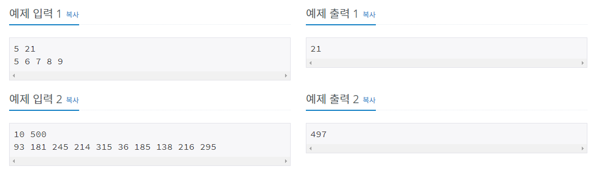 입력 받은 수를 하나씩 max_list의 가장 작은 수 min과 비교해서, min보다는 크지만 min 대신에 max_list에 들어와도 m을 넘지 않으면 조건에 성립한다고 생각했다.