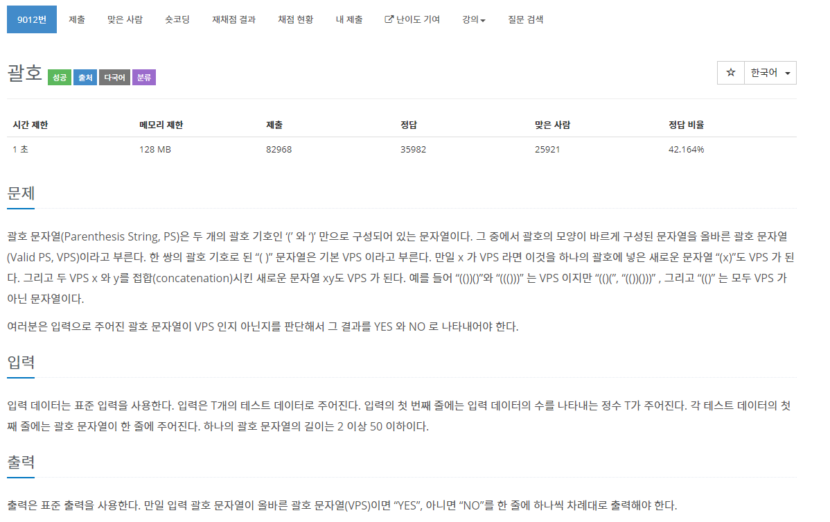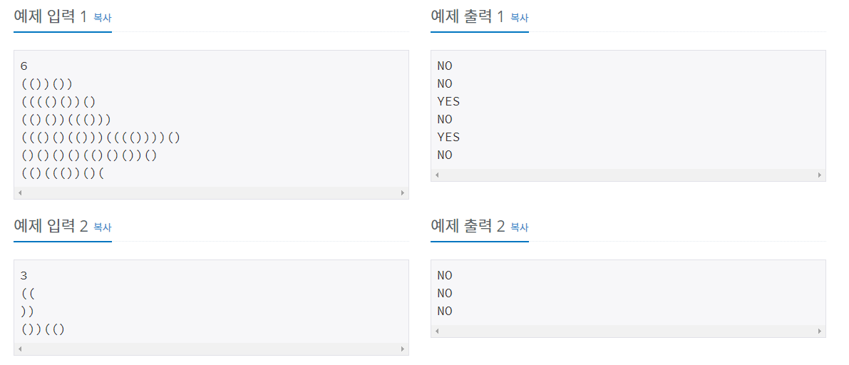 괄호 문자열(Parenthesis String, PS)은 두 개의 괄호 기호인 ‘(’ 와 ‘)’ 만으로 구성되어 있는 문자열이다. 그 중에서 괄호의 모양이 바르게 구성된 문자열을 올바른 괄호 문자열(Valid PS, VPS)이라고