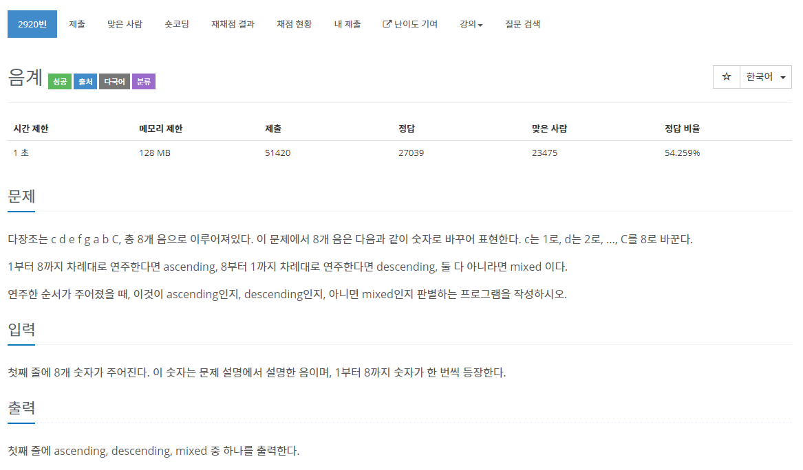 다장조는 c d e f g a b C, 총 8개 음으로 이루어져있다. 이 문제에서 8개 음은 다음과 같이 숫자로 바꾸어 표현한다. c는 1로, d는 2로, ..., C를 8로 바꾼다. 1부터 8까지 차례대로 연주한다면 ascending, 8