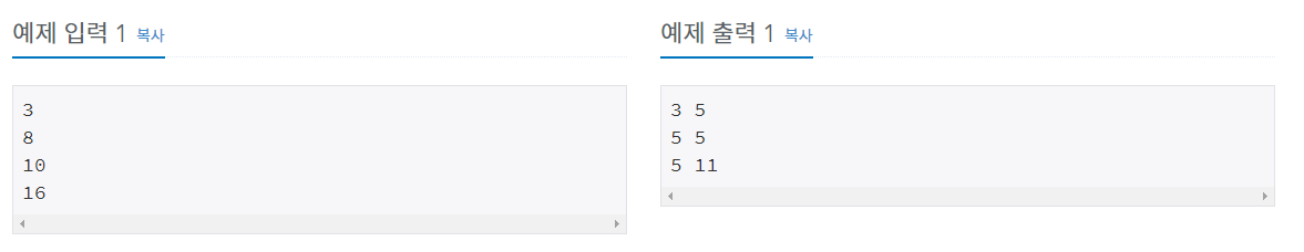 print(ans[i], num[i]-ans[i])728x90