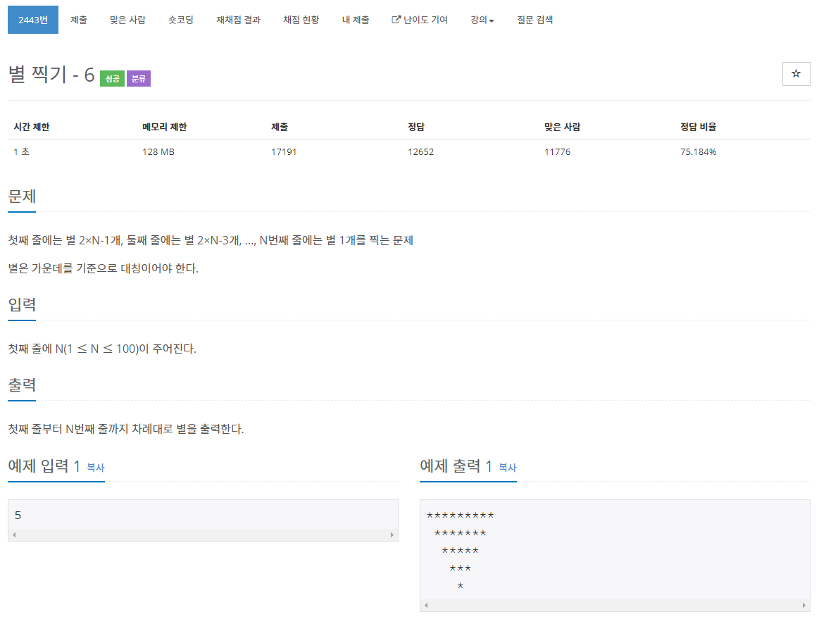 첫째 줄에는 별 2×N-1개, 둘째 줄에는 별 2×N-3개, ..., N번째 줄에는 별 1개를 찍는 문제 별은 가운데를 기준으로 대칭이어야 한다.