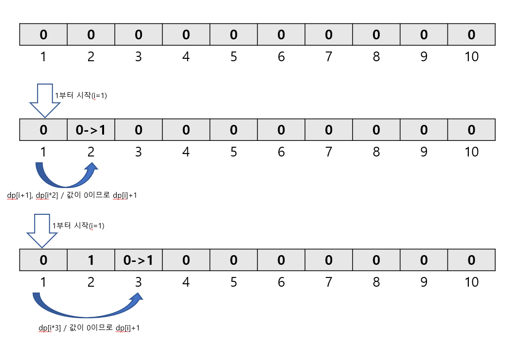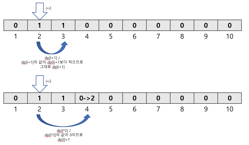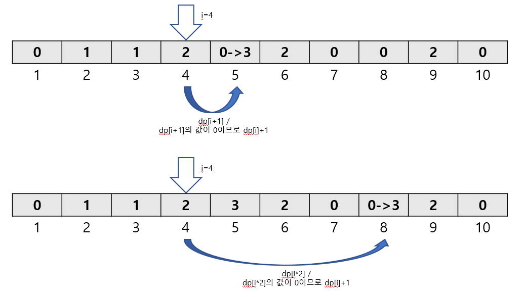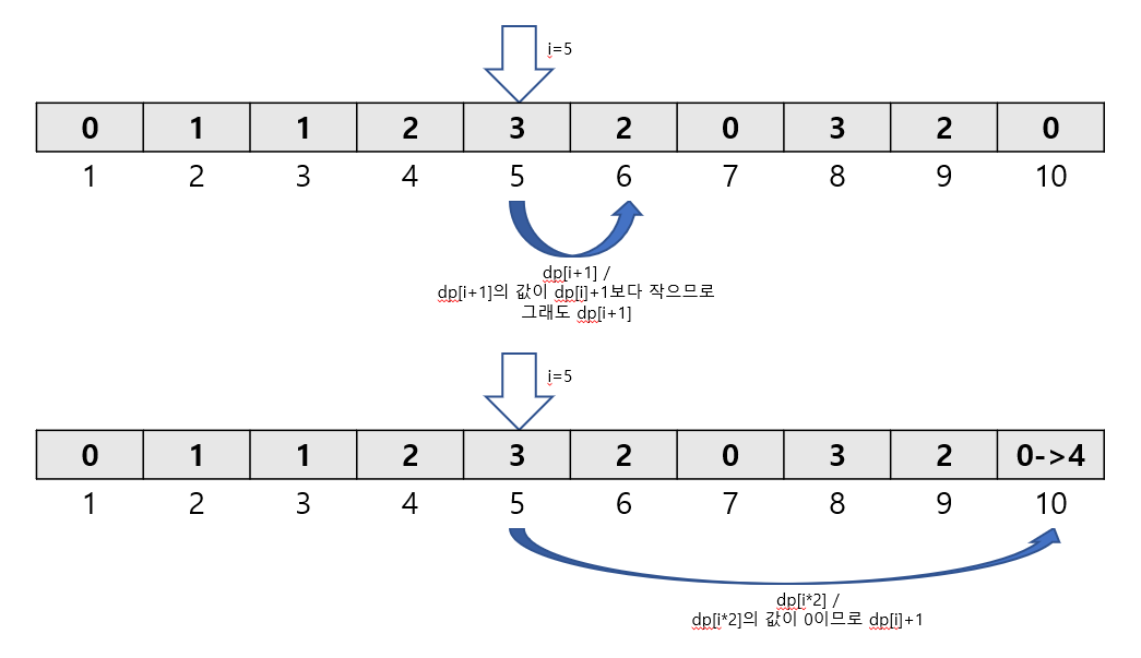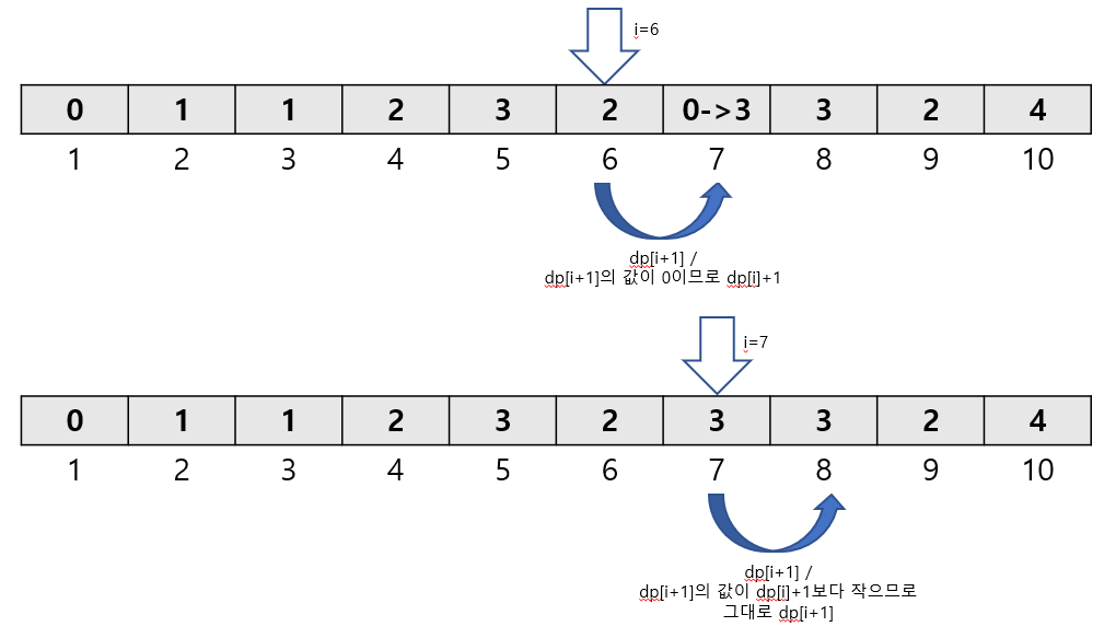 if (dp[i+1]==0) //i+1한 곳에 아직 한 번도 접근하지 않았다면