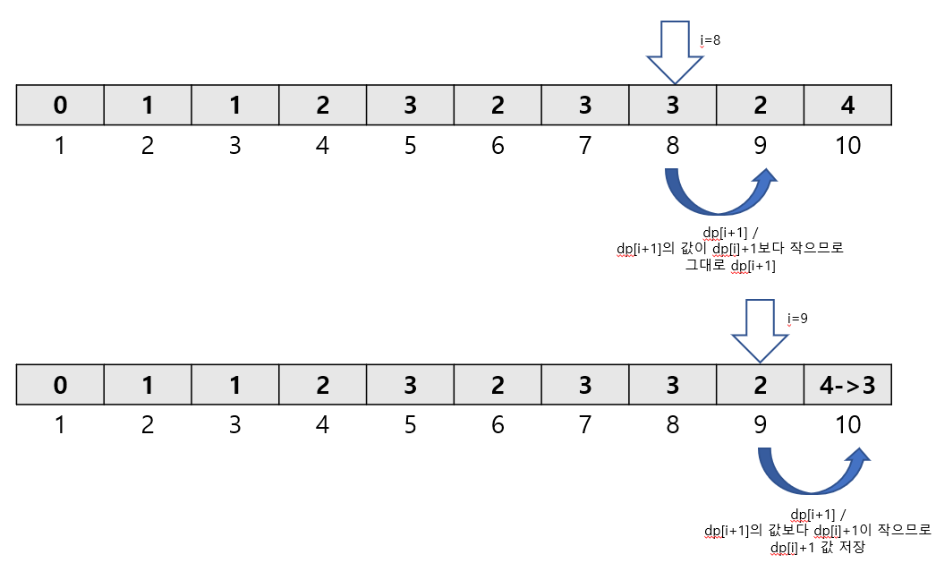 if (dp[i+1]>=dp[i]+1) //더 최단거리로 접근했을 때의 수를 저장