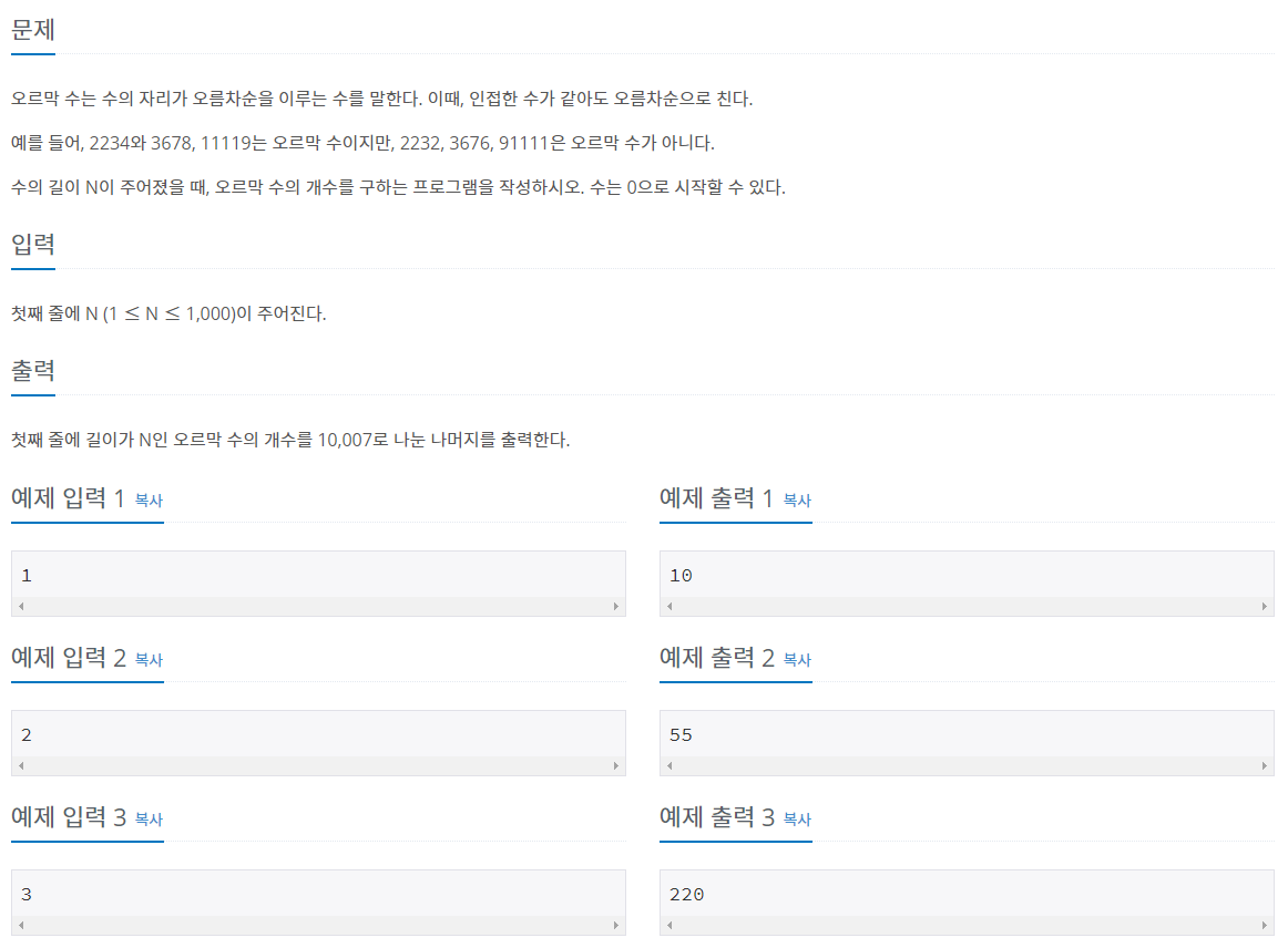 오르막 수는 수의 자리가 오름차순을 이루는 수를 말한다. 이때, 인접한 수가 같아도 오름차순으로 친다. 예를 들어, 2234와 3678, 11119는 오르막 수이지만, 2232, 3676, 91111은 오르막 수가 아니다. 수�