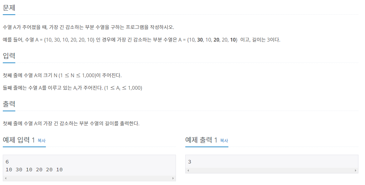 수열 A가 주어졌을 때, 가장 긴 감소하는 부분 수열을 구하는 프로그램을 작성하시오. 예를 들어, 수열 A = {10, 30, 10, 20, 20, 10} 인 경우에 가장 긴 감소하는 부분 수열은 A = {10, 30, 10, 20, 20, 10} �