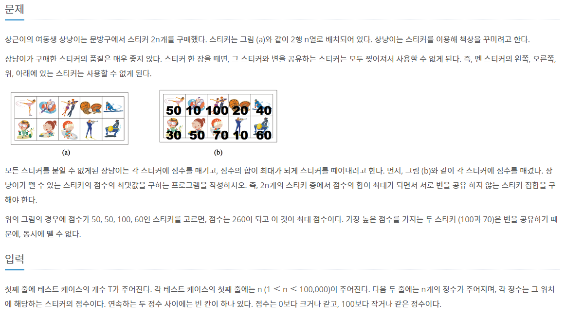 문제 상근이의 여동생 상냥이는 문방구에서 스티커 2n개를 구매했다. 스티커는 그림 (a)와 같이 2행 n열로 배치되어 있다. 상냥이는 스티커를 이용해 책상을 꾸미려고 한다. 상냥이가 구매한 스티