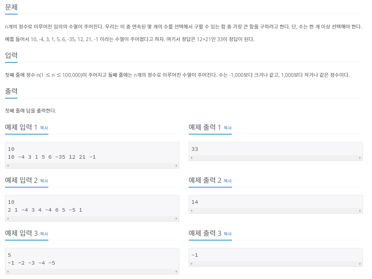 이렇게 하면 음수인 arr[i-1]를 포함하더라도 연속배열을 늘려 dp[i-1]를 더하는 것이 합이 더 큰 경우가 생긴다. (예제 입력 2번)