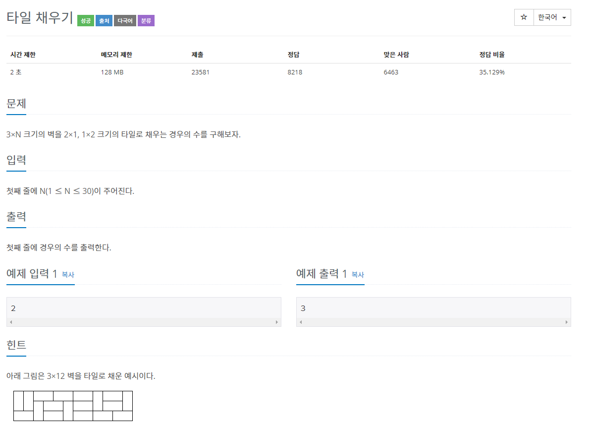 문제 3×N 크기의 벽을 2×1, 1×2 크기의 타일로 채우는 경우의 수를 구해보자. 입력 첫째 줄에 N(1 ≤ N ≤ 30)이 주어진다. 출력 첫째 줄에 경우의 수를 출력한다. 예제 입력 1 복사 2 예제 출력 1 복��