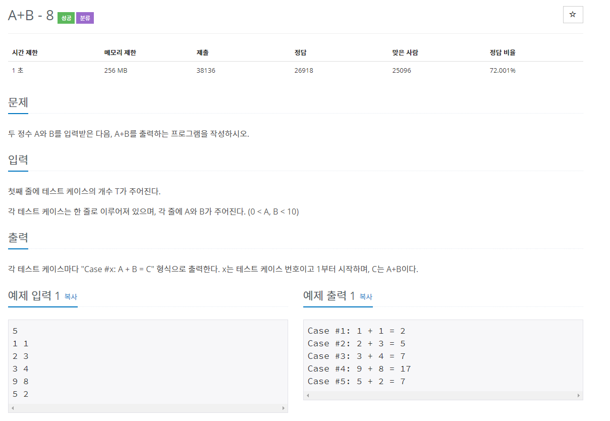 각 테스트 케이스마다 "Case #x: A + B = C" 형식으로 출력한다. x는 테스트 케이스 번호이고 1부터 시작하며, C는 A+B이다.