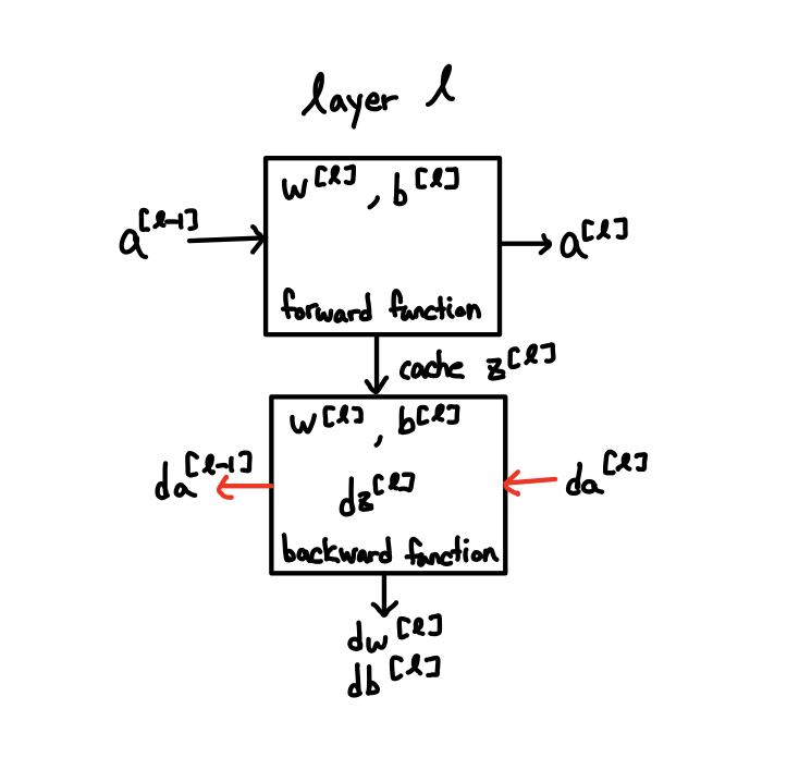 Forward function에서 input으로 $a^{[l-1]}$이 들어가면, output으로 $a^{[l]}$이 나온다.