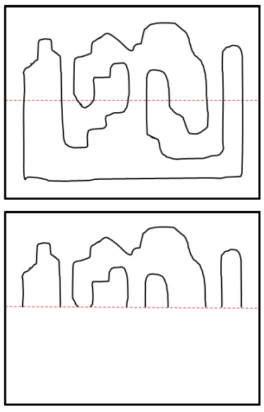 창수는 마우스를 이용하여 캔버스에 그림을 그리고 있다. 지금은 캔버스에 곡선을 그리는데, 시작점과 끝점이 붙어있는 것 외에는 중간에 선이 교차하거나 붙는 경우가 없다. 곡선을 다 그린 다음, 캔버스에서 x축의 아래쪽 영역을 깨끗이 지우면 아래 그림처럼 경계선이 서로 만나지 않는 봉우리들의 패턴이 나타난다. 여기서 봉우리는 시작점과 끝점이 x축 상에 있는 곡선 부분과 x축으로 둘러싸인 영역을 말한다. 아래 그림의 예에서는 5개의 봉우리가 나타난다.