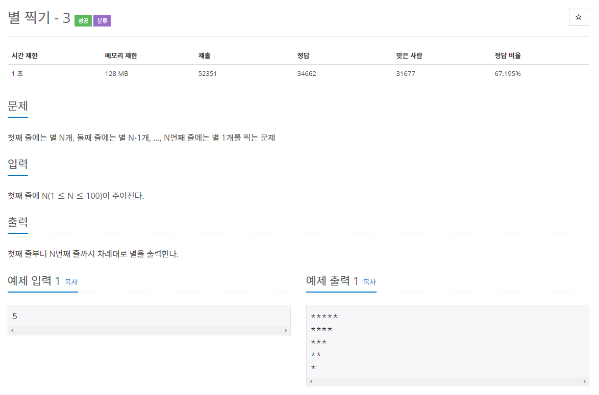첫째 줄에는 별 N개, 둘째 줄에는 별 N-1개, ..., N번째 줄에는 별 1개를 찍는 문제