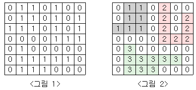 <그림 1>과 같이 정사각형 모양의 지도가 있다. 1은 집이 있는 곳을, 0은 집이 없는 곳을 나타낸다. 철수는 이 지도를 가지고 연결된 집의 모임인 단지를 정의하고, 단지에 번호를 붙이려 한다. 여