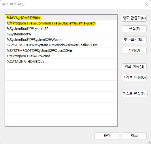 다시 찾아보니 위의 Path를 삭제하지 말고, %JAVA_HOME%\bin이 C:\Program Files\Common Files\Oracle\Java\javapath 보다 상단에 위치하기만 하면 된다고 한다.