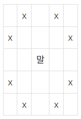 동물원에서 막 탈출한 원숭이 한 마리가 세상구경을 하고 있다. 그 녀석은 말(Horse)이 되기를 간절히 원했다. 그래서 그는 말의 움직임을 유심히 살펴보고 그대로 따라 하기로 하였다. 말은 말이다. 말은 격자판에서 체스의 나이트와 같은 이동방식을 가진다. 다음 그림에 말의 이동방법이 나타나있다. x표시한 곳으로 말이 갈 수 있다는 뜻이다. 참고로 말은 장애물을 뛰어넘을 수 있다.