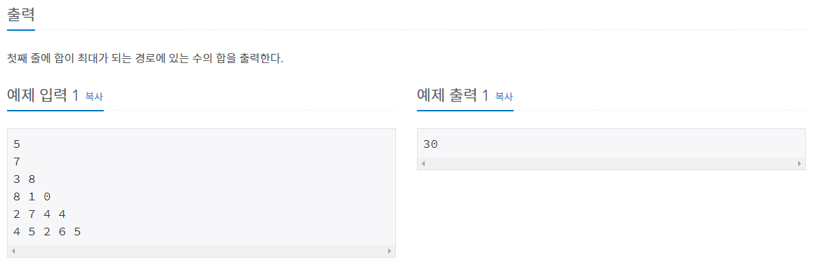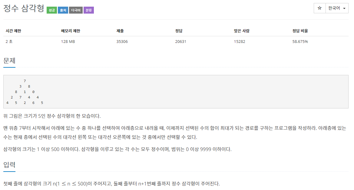 문제 7 3 8 8 1 0 2 7 4 4 4 5 2 6 5 위 그림은 크기가 5인 정수 삼각형의 한 모습이다. 맨 위층 7부터 시작해서 아래에 있는 수 중 하나를 선택하여 아래층으로 내려올 때, 이제까지 선택된 수의 합이 최�