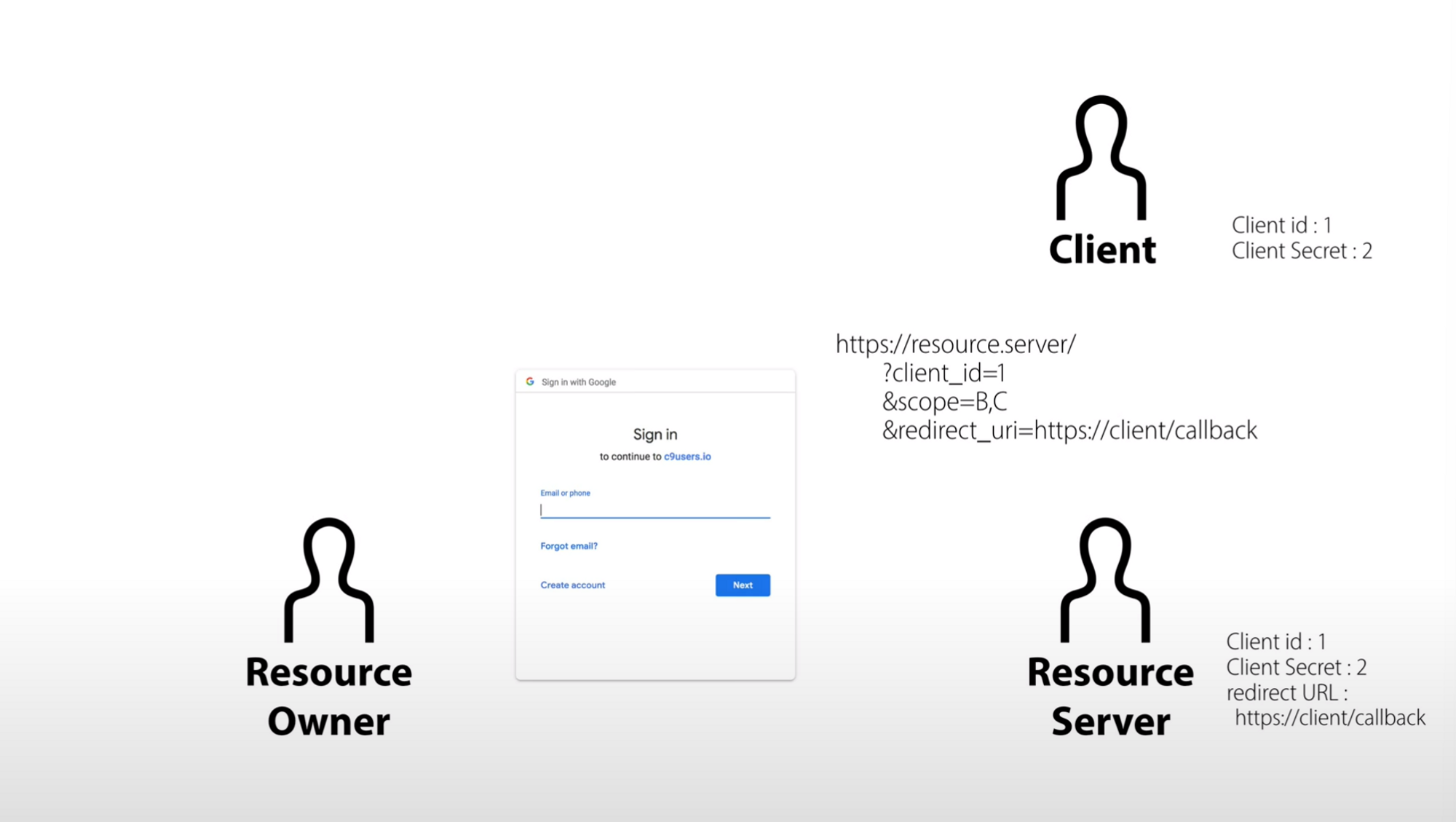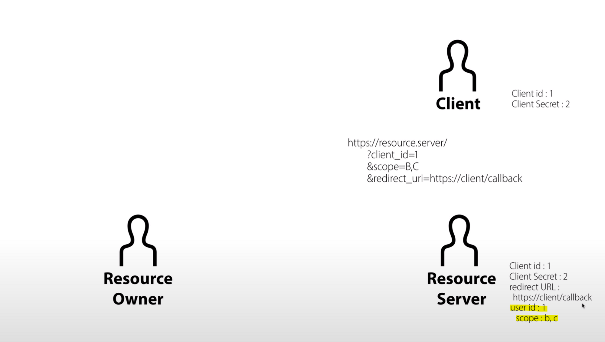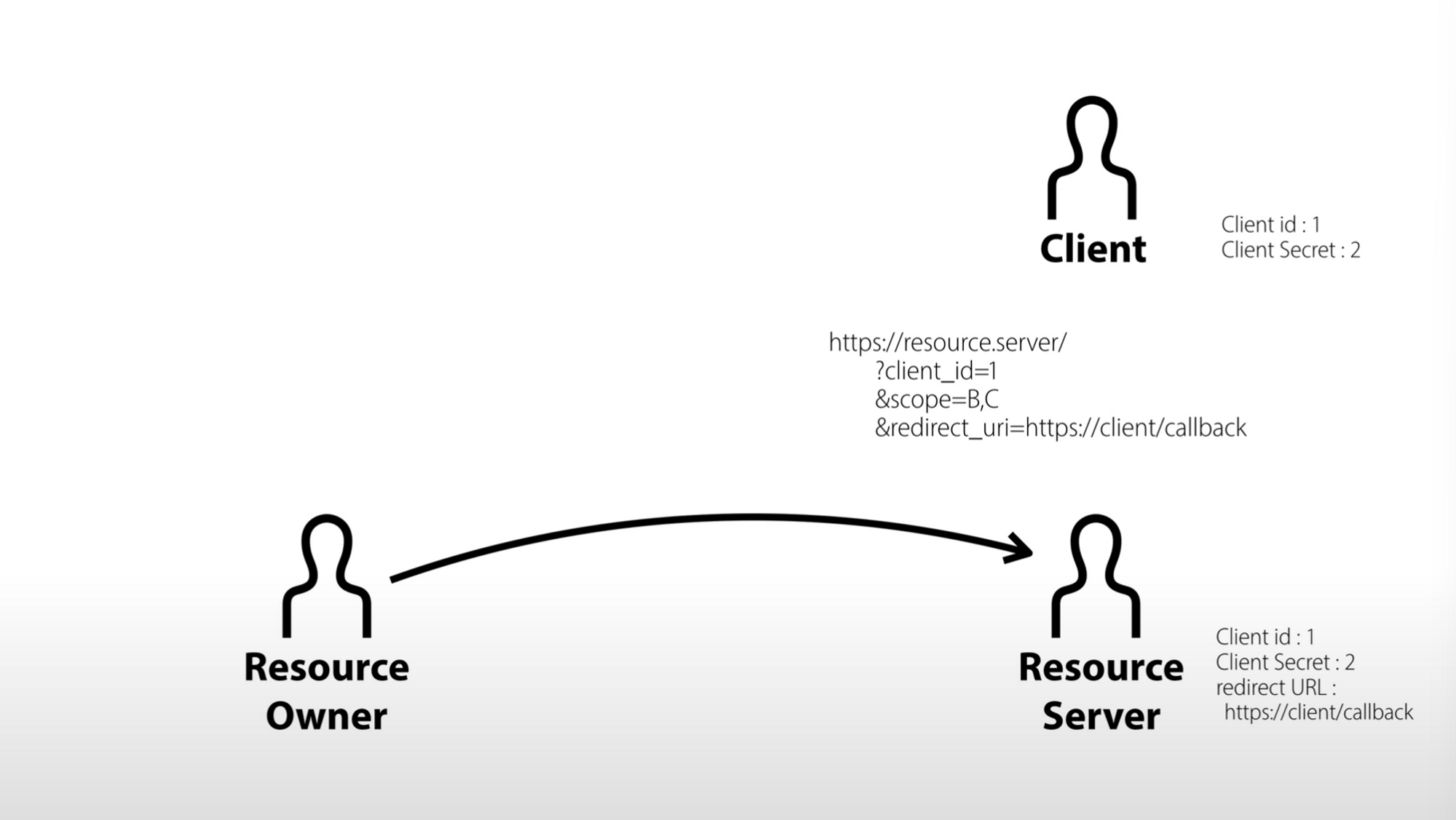 https://resource.server/?client_id=1&scope=B,C&redirect_uri=https://client/callback과 같은 링크를 만들어준다.