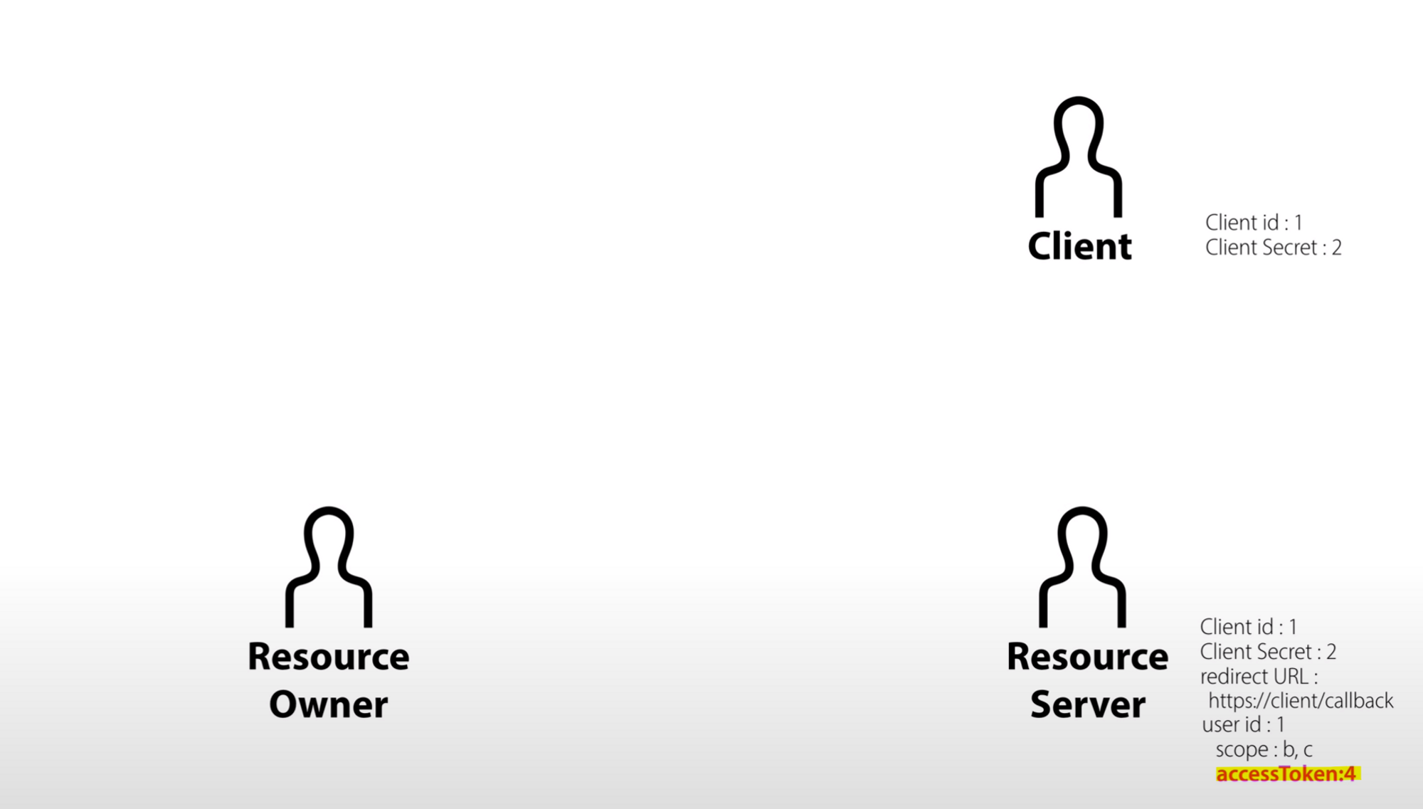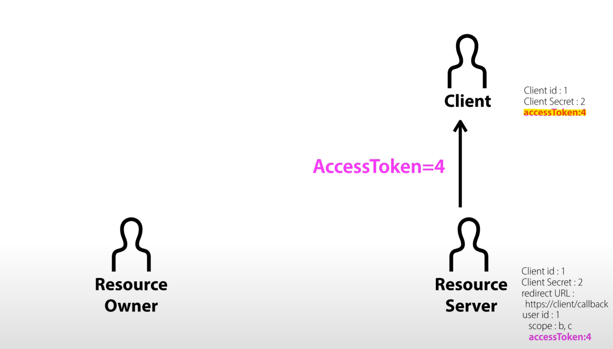 - client가 4라고 하는 access token으로 접근했을 때 resource server는 b와 c의 권한을 가진 user id 1번 사용자의 정보를 허용해준다.