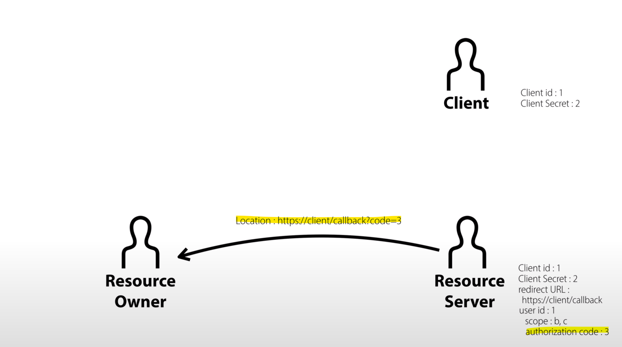 - resource server는 임시 비밀번호 개념인 authorization code를 위의 url 형식으로 Location 헤더에 담아 resource owner에세 전송한다.