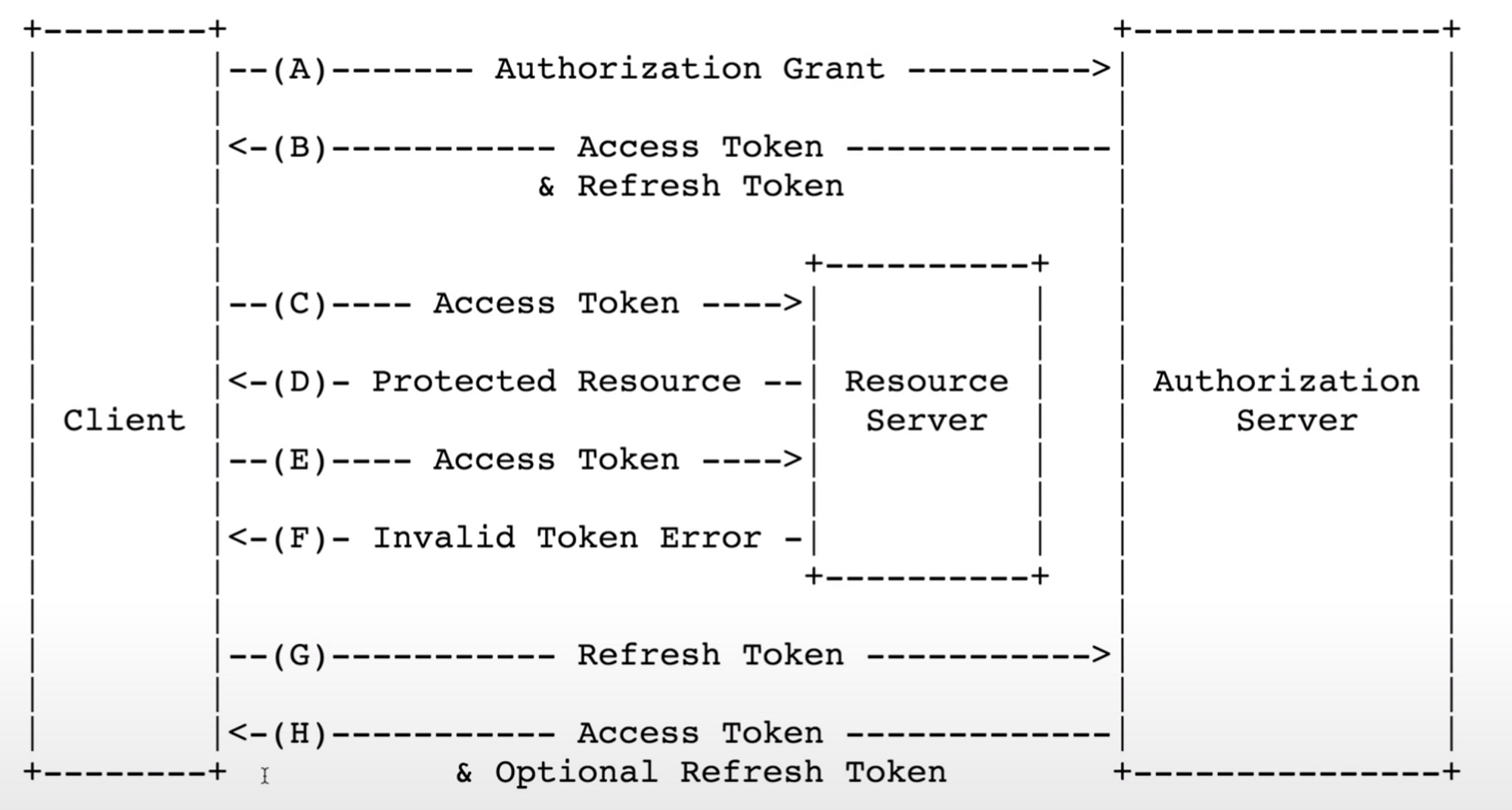 Access Token: client는 가지고 있는 access token으로 계속 resource server의 resource를 요청한다. - (F)