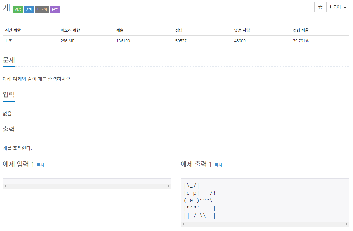 문제 아래 예제와 같이 개를 출력하시오. 입력 출력 예제 입력 1 복사 예제 출력 1 복사 |\_/| |q p| /} ( 0 )"""\ |"^"` | ||_/=\\__|...