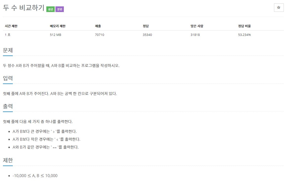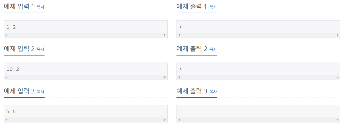 두 정수 A와 B가 주어졌을 때, A와 B를 비교하는 프로그램을 작성하시오.