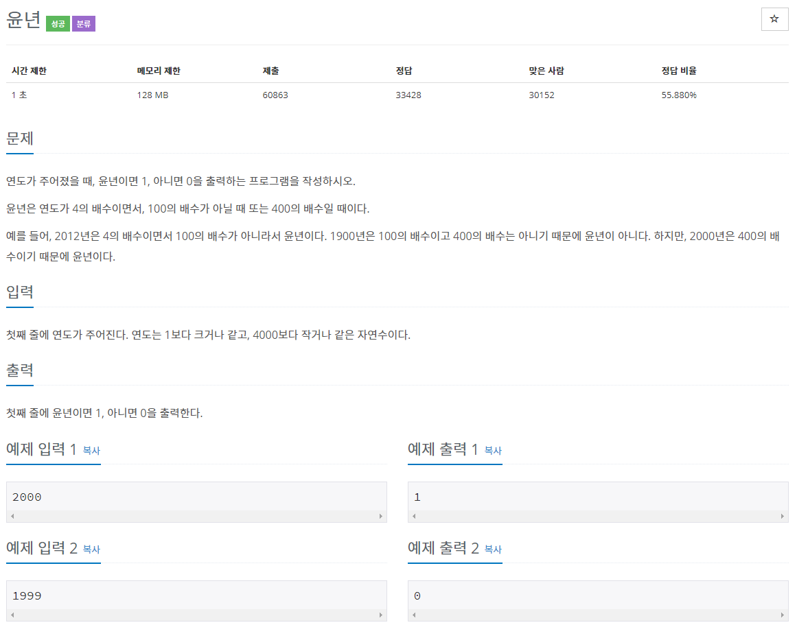 연도가 주어졌을 때, 윤년이면 1, 아니면 0을 출력하는 프로그램을 작성하시오. 윤년은 연도가 4의 배수이면서, 100의 배수가 아닐 때 또는 400의 배수일 때이다. 예를 들어, 2012년은 4의 배수이면서