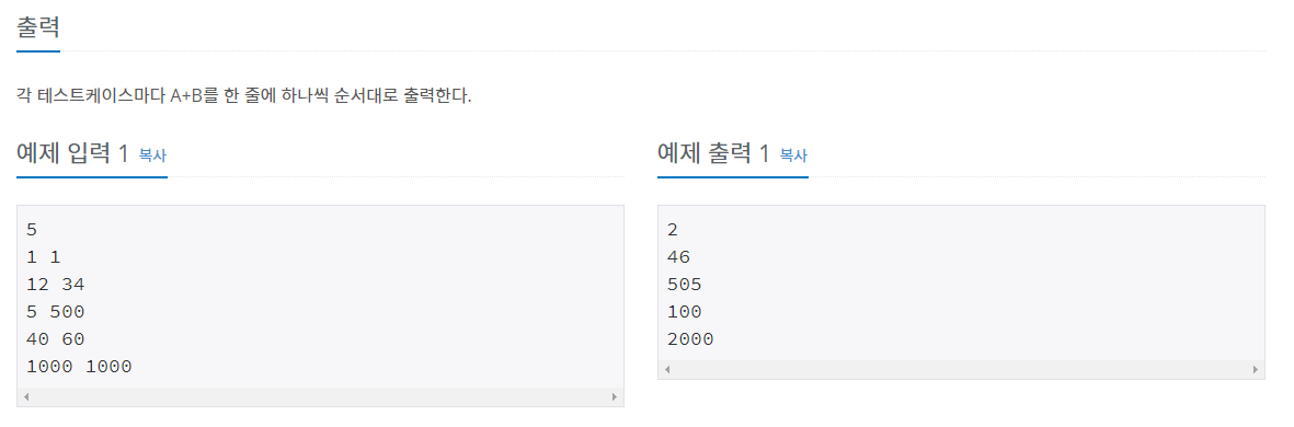 첫 줄에 테스트케이스의 개수 T가 주어진다. T는 최대 1,000,000이다. 다음 T줄에는 각각 두 정수 A와 B가 주어진다. A와 B는 1 이상, 1,000 이하이다.