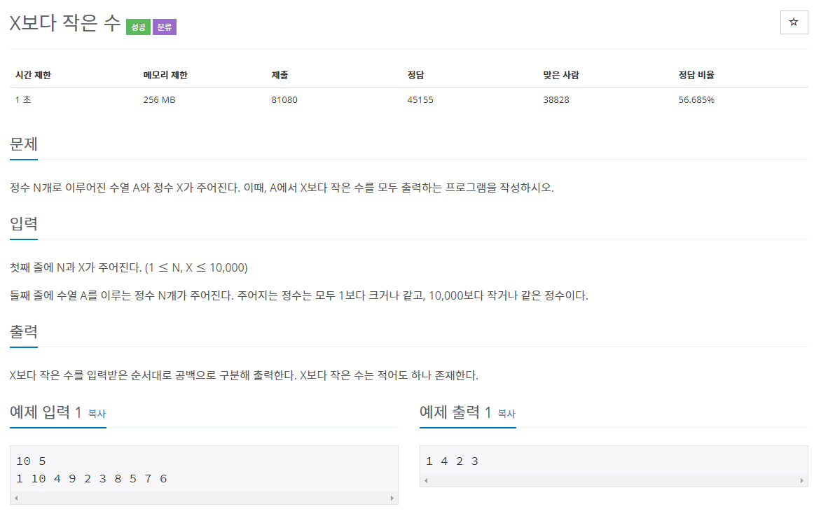 첫째 줄에 N과 X가 주어진다. (1 ≤ N, X ≤ 10,000) 둘째 줄에 수열 A를 이루는 정수 N개가 주어진다. 주어지는 정수는 모두 1보다 크거나 같고, 10,000보다 작거나 같은 정수이다.