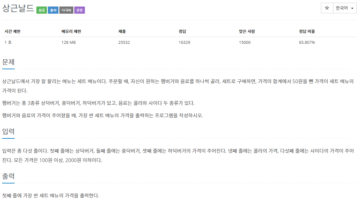문제 상근날드에서 가장 잘 팔리는 메뉴는 세트 메뉴이다. 주문할 때, 자신이 원하는 햄버거와 음료를 하나씩 골라, 세트로 구매하면, 가격의 합계에서 50원을 뺀 가격이 세트 메뉴의 가격이 된��