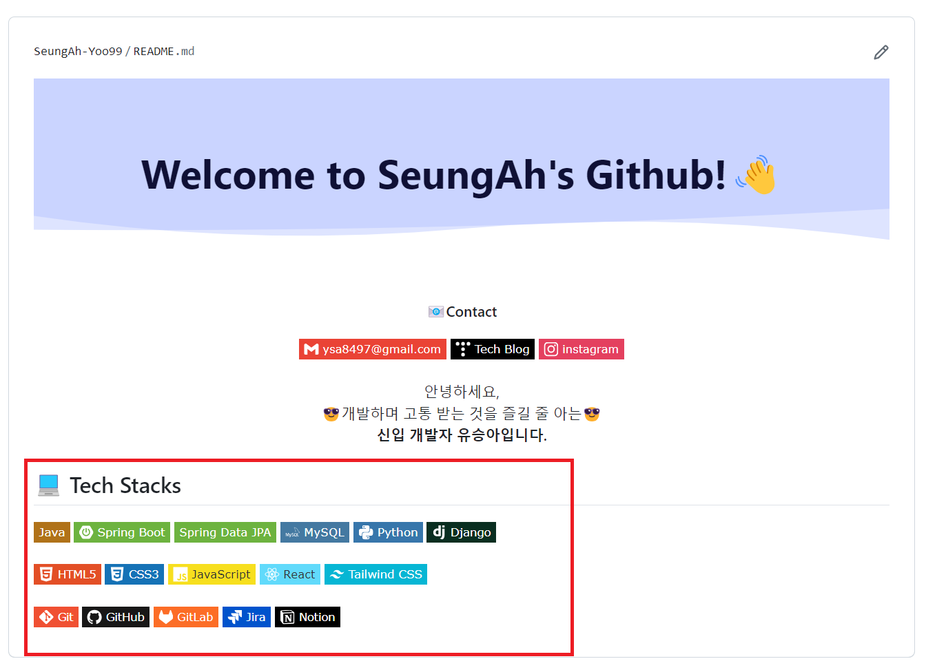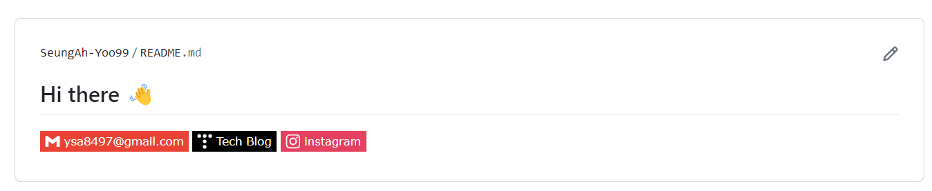 Contact ๋ฑ์ง์ ๋ง์ฐฌ๊ฐ์ง๋ก Shields.io๋ฅผ ์ฌ์ฉํ์ฌ ๋ฑ์ง๋ฅผ ๋ฃ์ด์ค ๊ฒ์ด๋ค.