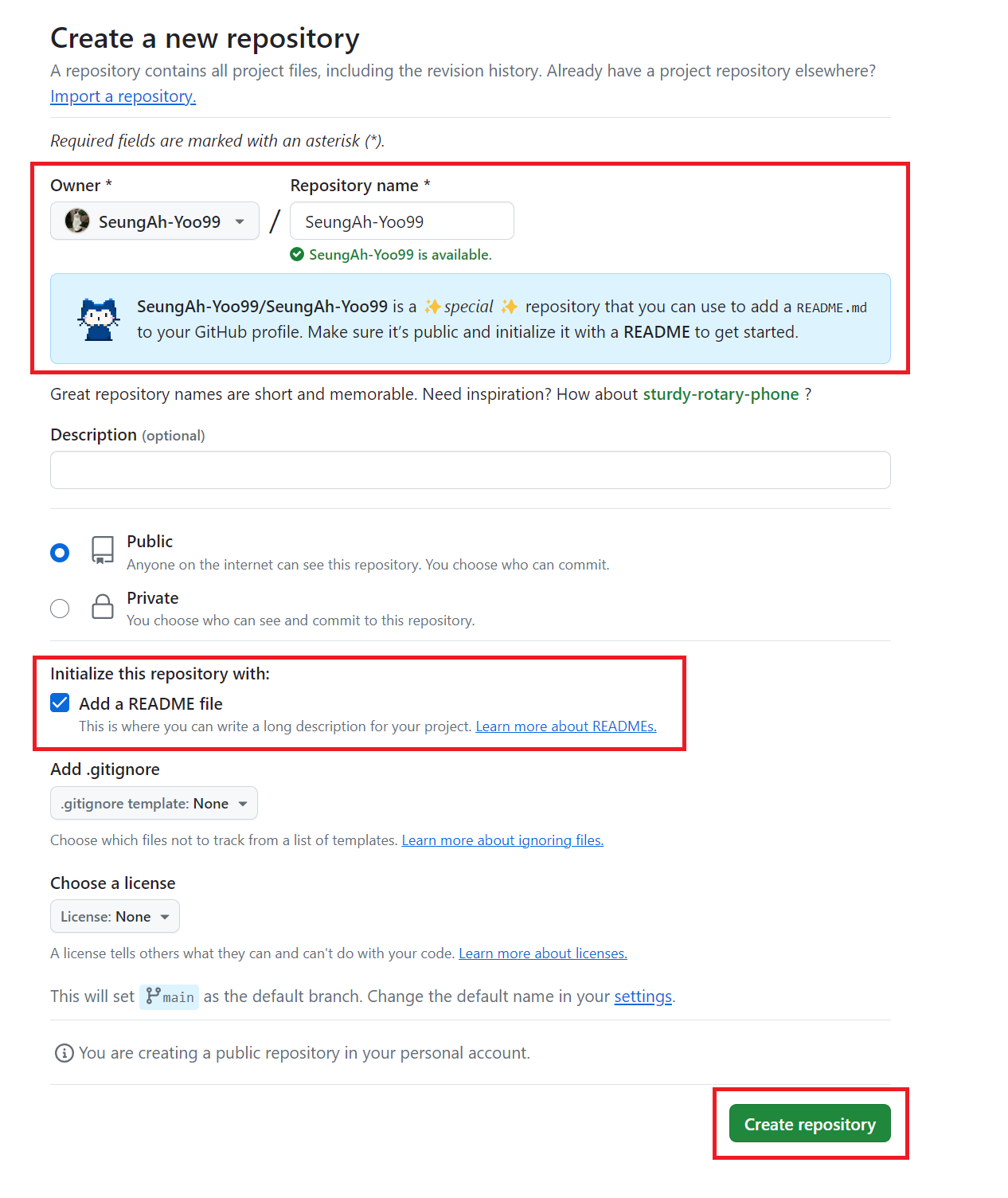 Add a README file์ ์ฒดํฌํด์ฃผ๊ณ Create repository๋ฅผ ๋๋ฌ์ฃผ๋ฉด ํ๋กํ ๊พธ๋ฐ ์ค๋น ์๋ฃ!