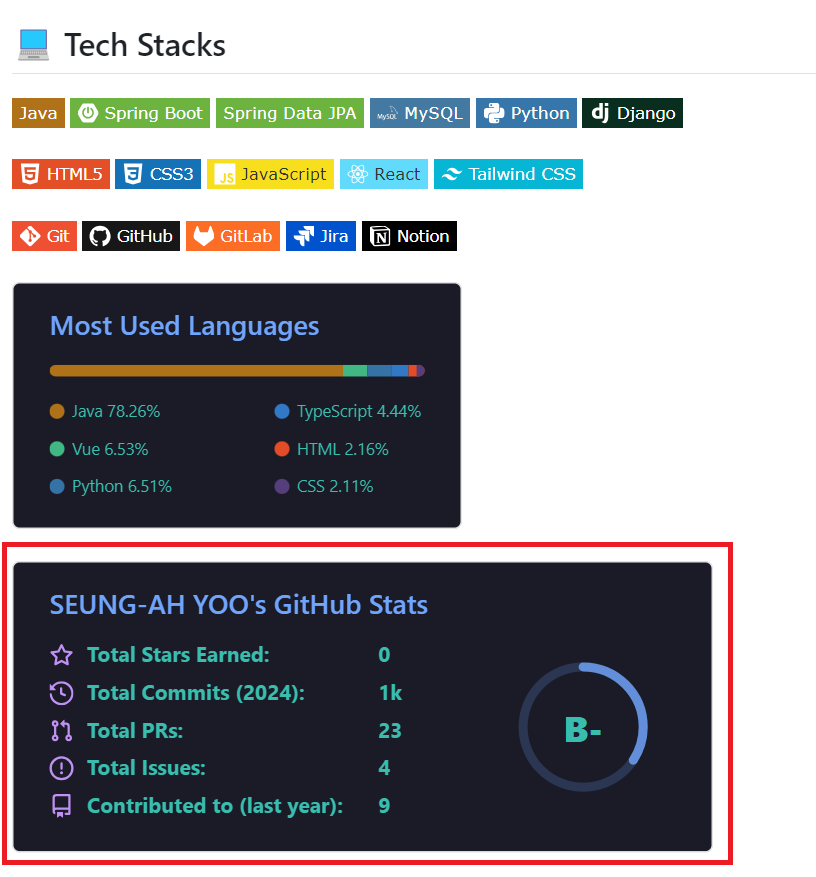 Most Used Languages ์นด๋์ ๋ง์ฐฌ๊ฐ์ง๋ก github-readme-stats์์ Github Stats Card๋ฅผ ์ฐพ๊ณ ์ฝ๋๋ฅผ ์ถ๊ฐํด์ค๋ค.