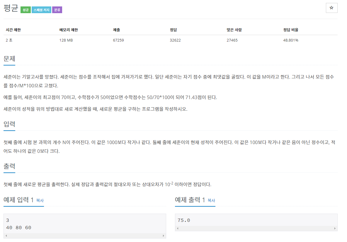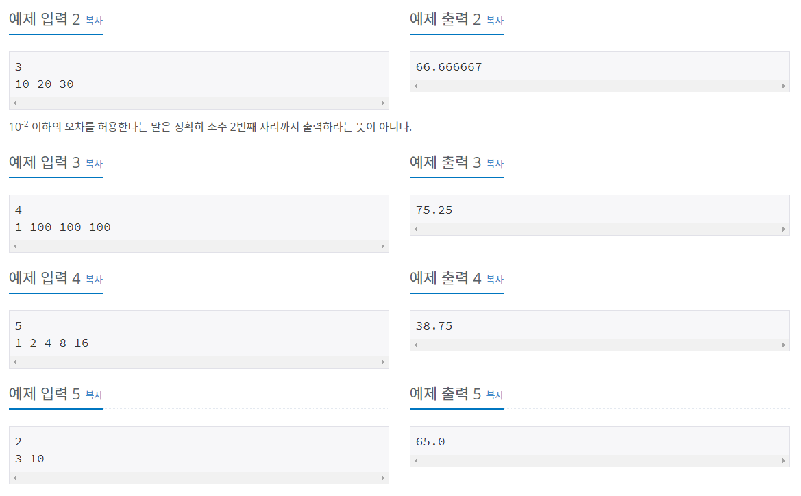 첫째 줄에 시험 본 과목의 개수 N이 주어진다. 이 값은 1000보다 작거나 같다. 둘째 줄에 세준이의 현재 성적이 주어진다. 이 값은 100보다 작거나 같은 음이 아닌 정수이고, 적어도 하나의 값은 0보