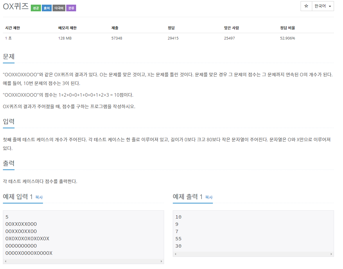 문제 "OOXXOXXOOO"와 같은 OX퀴즈의 결과가 있다. O는 문제를 맞은 것이고, X는 문제를 틀린 것이다. 문제를 맞은 경우 그 문제의 점수는 그 문제까지 연속된 O의 개수가 된다. 예를 들어, 10번 문제의 �
