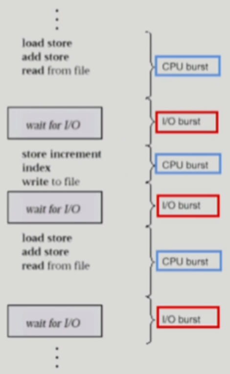 CPU burst : CPU만 연속적으로 사용하며 instruction을 실행하는 단계. 이 단계에서 사용자 프로그램은 cpu 내에서 일어나는 명령이나 메모리에 접근하는 일반 명령을 사용할 수 있다.