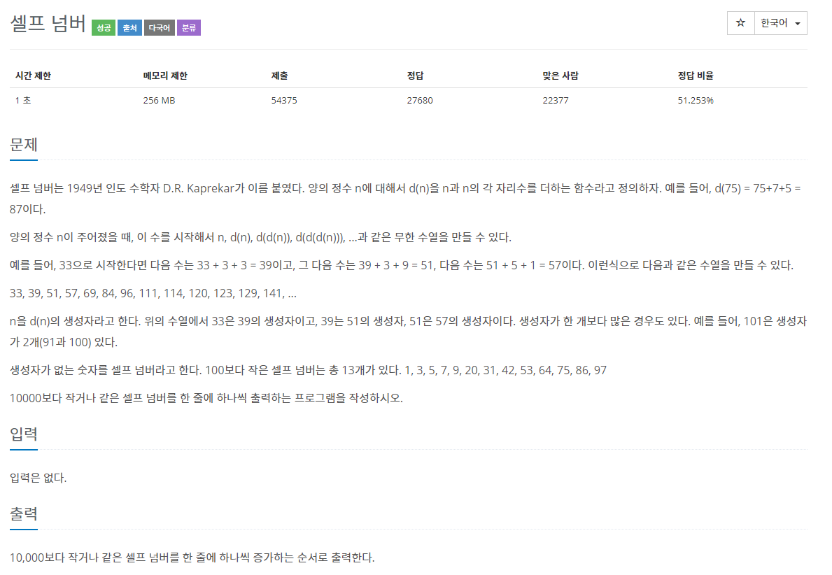 문제 셀프 넘버는 1949년 인도 수학자 D.R. Kaprekar가 이름 붙였다. 양의 정수 n에 대해서 d(n)을 n과 n의 각 자리수를 더하는 함수라고 정의하자. 예를 들어, d(75) = 75+7+5 = 87이다. 양의 정수 n이 주어졌�